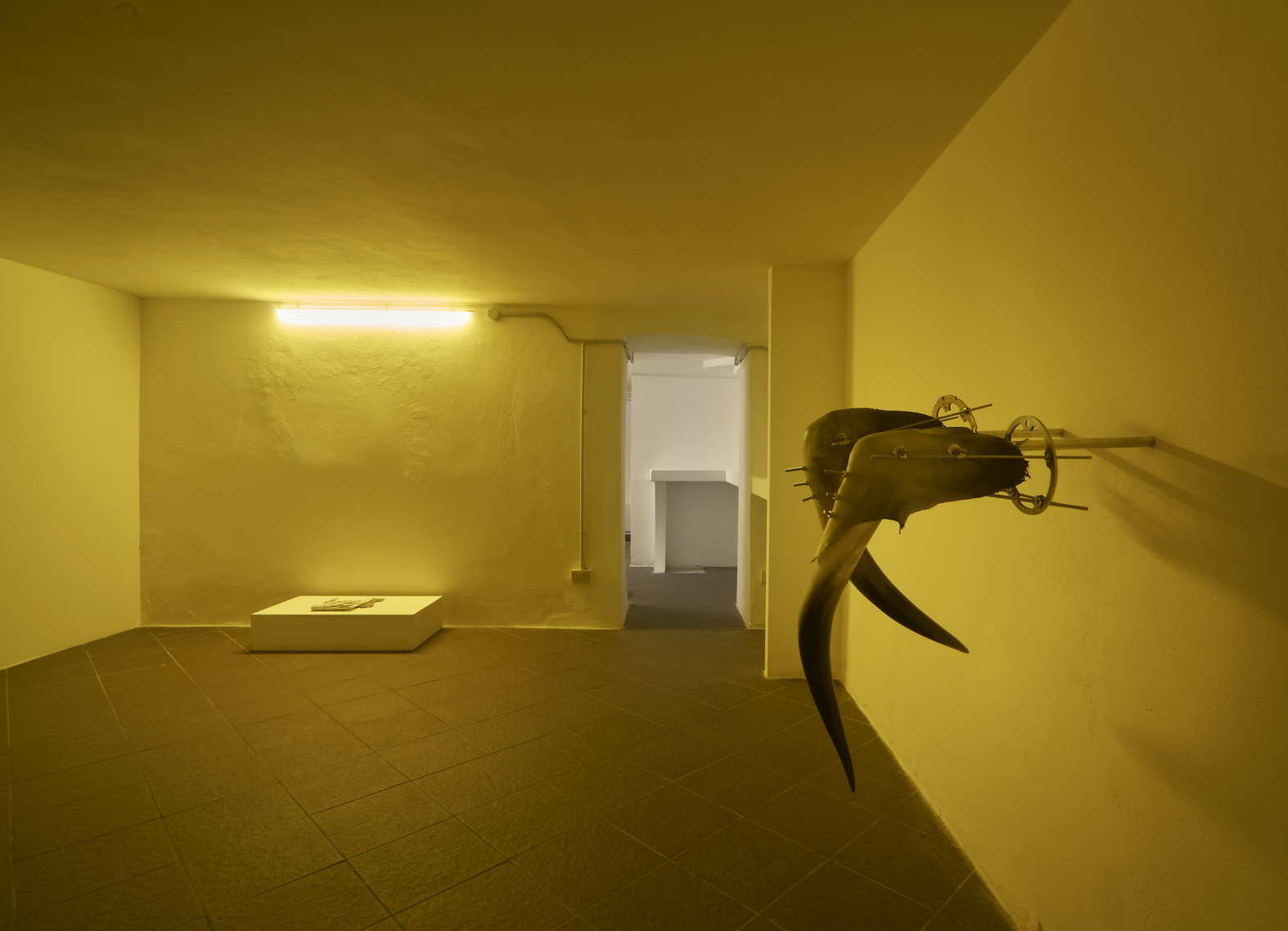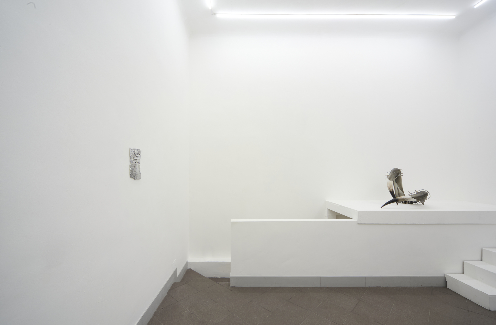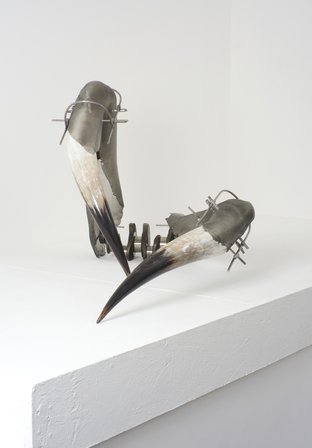 Sophia Gatzkan’s work addresses the exploration of the human body in relation to non-normative morphologies and the complexities of contemporary identity. Using a language that combines organicity and artifice, the artist interrogates common notions of normality, ability and bodily integrity, proposing a critical reinterpretation of the body and its representation as dimensions of transformation, ambiguity and possibility. Her work is nourished by a dialogue with post-humanist studies, opening up reflections on how the representation of the body is fabricated, mediated and politicised in order to activate a space where fragility and power intertwine in new forms of existence. Her sculptural practice is a hybrid territory in which more or less recognisable portions of the human body merge with objects peeled away from their original function, yet evocative and charged with narrative potential. From these casts of anatomical fragments, Gatzkan seeks figurative ways of staging an encounter between the human and the non-human. Hybrid forms emerge, crossed by the concept of prosthesis, understood as technology capable of amplifying the capabilities of these blended bodies; evanescent, almost spectral figures crystallised in a tension between permanence and precariousness. Elements such as orthopaedic fixators invite caution, while materials such as horn herald slow regeneration; symbols midway on the spectrum between self-defence and violence, leaving the viewer in a state of uncertainty or even apprehension. Despite this apparent immobility, the sculptures are anything but static, becoming theoretical devices that invite us to reconsider bodily experience not as a defined unit, but as a continuum of possibilities and mutations. As in Ciobanu’s work, Gatzkan creates subterranean narratives that speculate on the instability of identity and how it adapts, protects, expands or reinvents itself. To heal, one must first hurt.