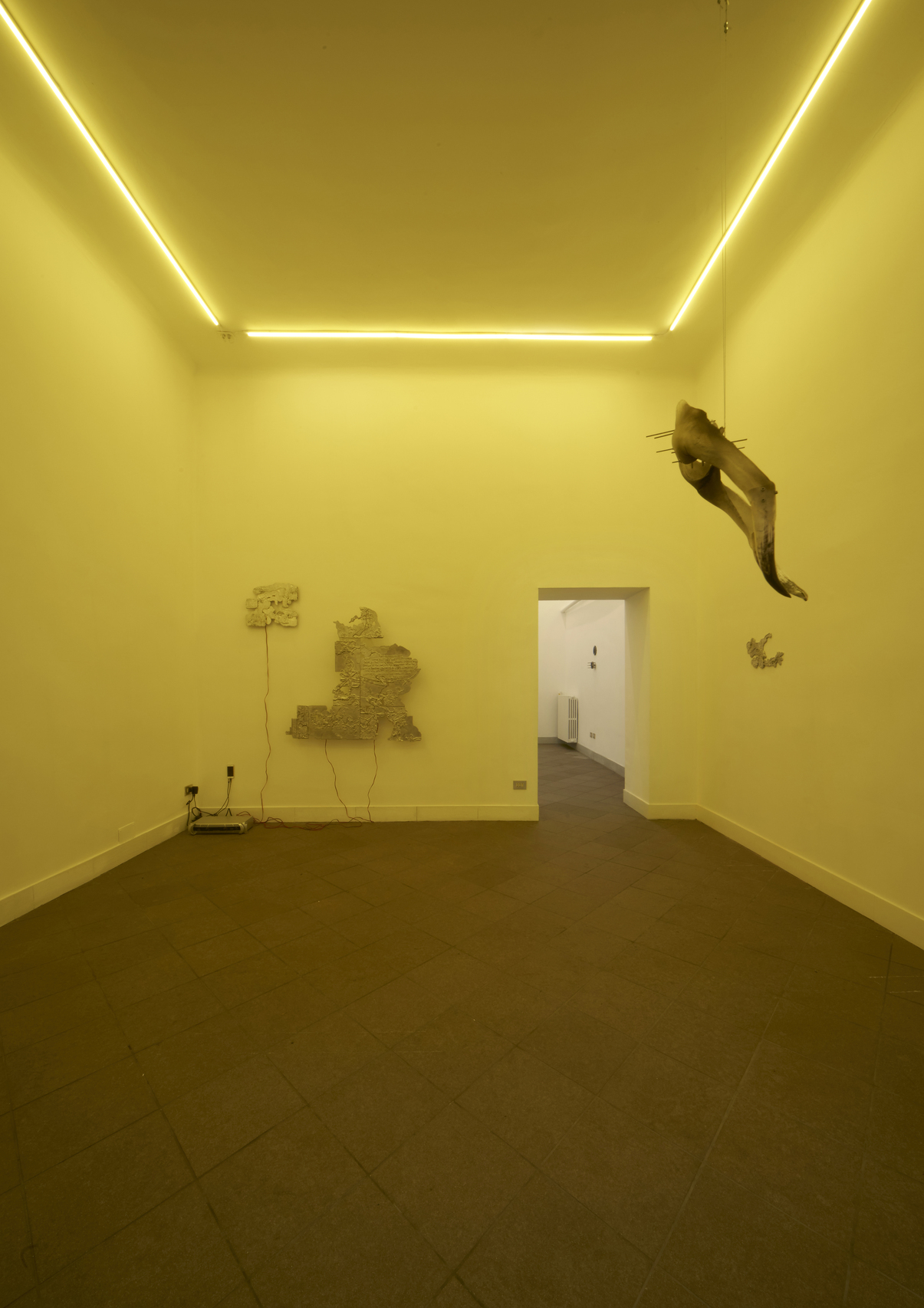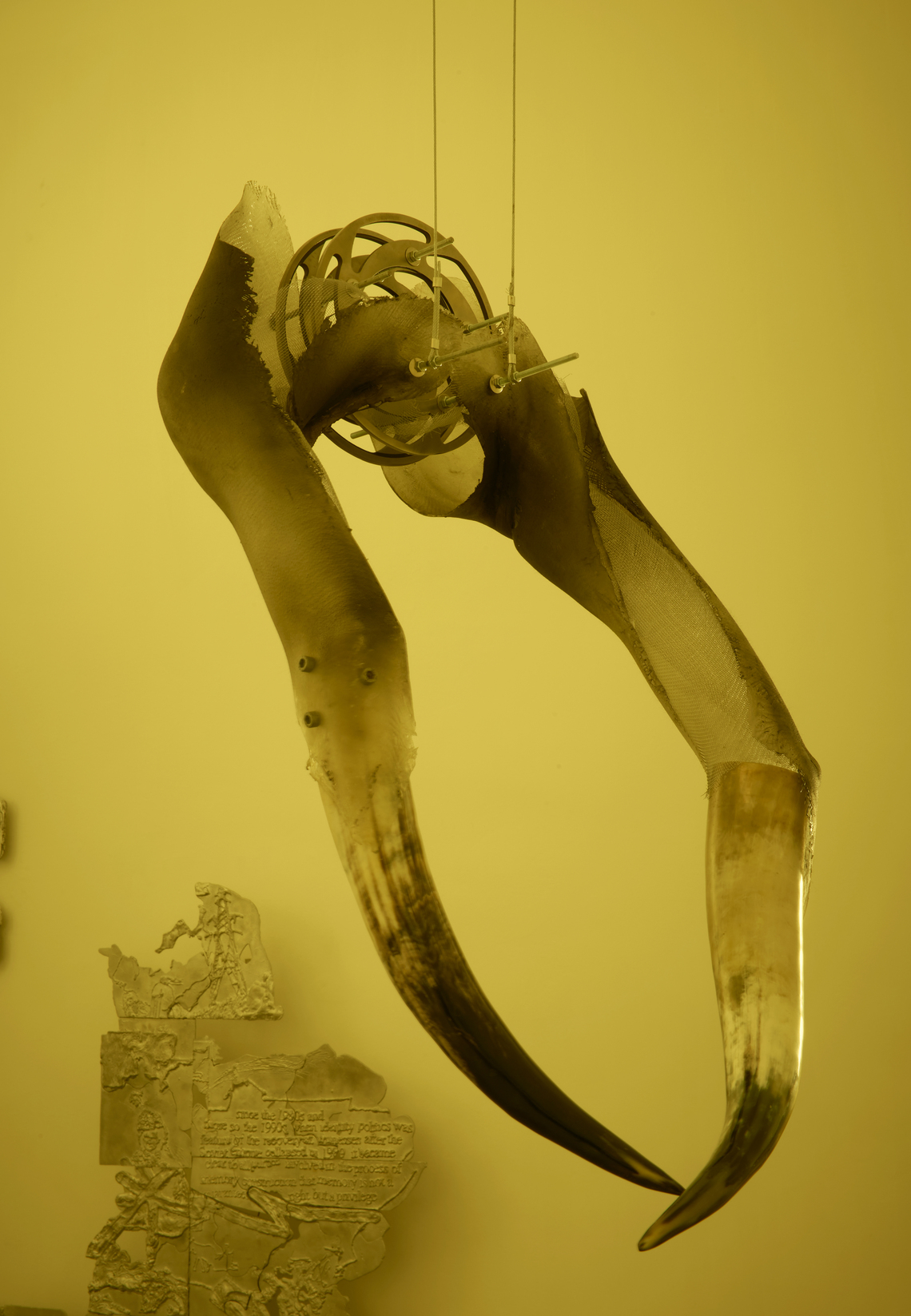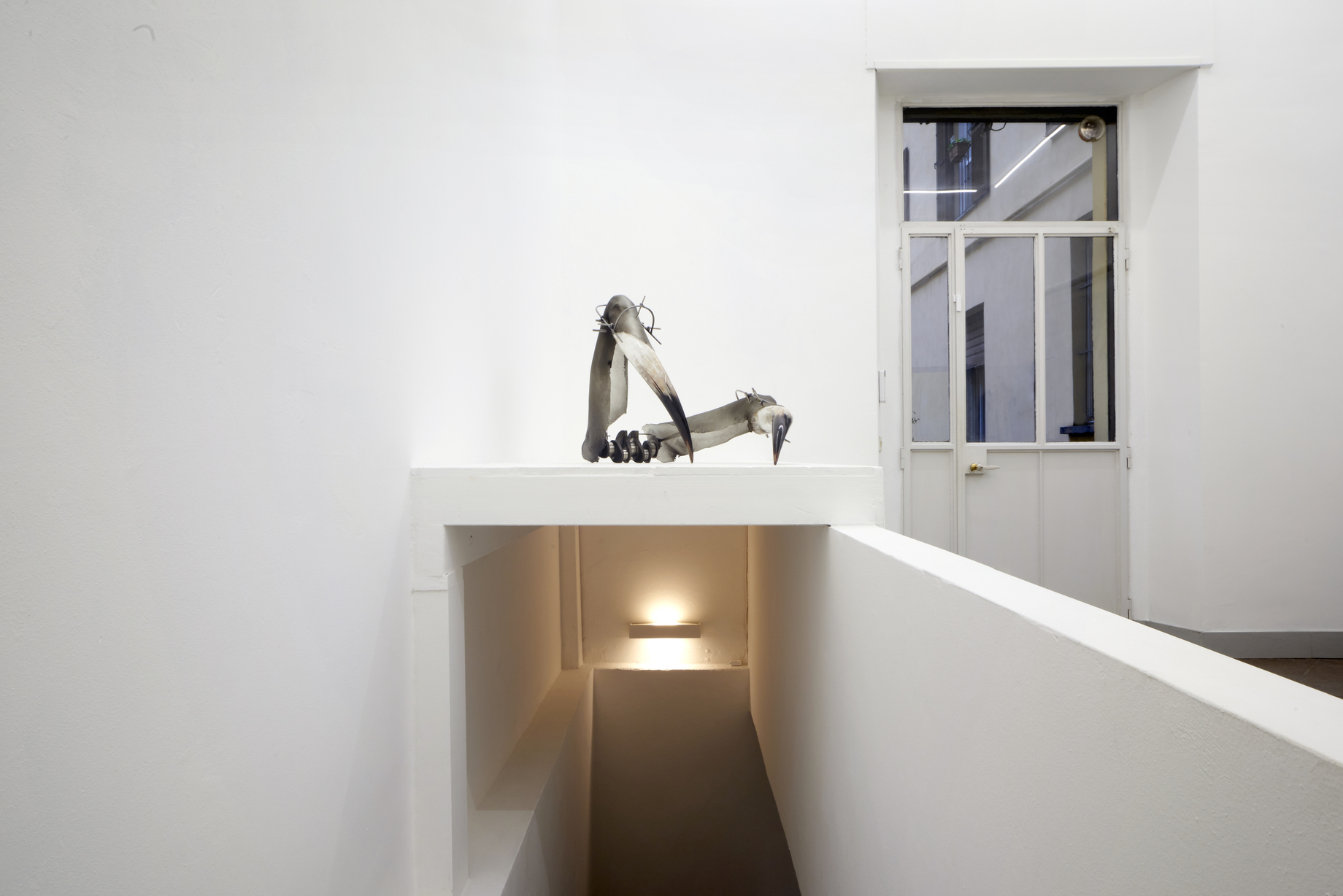Sophia Gatzkan’s work addresses the exploration of the human body in relation to non-normative morphologies and the complexities of contemporary identity. Using a language that combines organicity and artifice, the artist interrogates common notions of normality, ability and bodily integrity, proposing a critical reinterpretation of the body and its representation as dimensions of transformation, ambiguity and possibility. Her work is nourished by a dialogue with post-humanist studies, opening up reflections on how the representation of the body is fabricated, mediated and politicised in order to activate a space where fragility and power intertwine in new forms of existence. Her sculptural practice is a hybrid territory in which more or less recognisable portions of the human body merge with objects peeled away from their original function, yet evocative and charged with narrative potential. From these casts of anatomical fragments, Gatzkan seeks figurative ways of staging an encounter between the human and the non-human. Hybrid forms emerge, crossed by the concept of prosthesis, understood as technology capable of amplifying the capabilities of these blended bodies; evanescent, almost spectral figures crystallised in a tension between permanence and precariousness. Elements such as orthopaedic fixators invite caution, while materials such as horn herald slow regeneration; symbols midway on the spectrum between self-defence and violence, leaving the viewer in a state of uncertainty or even apprehension. Despite this apparent immobility, the sculptures are anything but static, becoming theoretical devices that invite us to reconsider bodily experience not as a defined unit, but as a continuum of possibilities and mutations. As in Ciobanu’s work, Gatzkan creates subterranean narratives that speculate on the instability of identity and how it adapts, protects, expands or reinvents itself. To heal, one must first hurt.